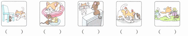 The cat sleeps in his bed. The mouse is by the cat. He eats the cat’s food(食物). The cat wakes up. The mouse is afraid(害怕)and runs away. The cat runs after the mouse. The mouse is on the top of the shelf. The cat jumps and jumps(跳来跳去). But he can’t get the mouse. The mouse is under the chair. The cat is