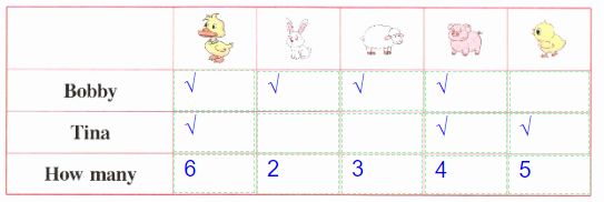 六、听录音,在 Bobby 和 Tina 看到的动物下画“√”并写下数量。(听两遍)