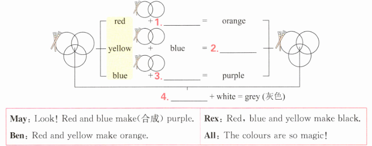 识,将对应的调色盘涂色,并填写正确的颜色单词。