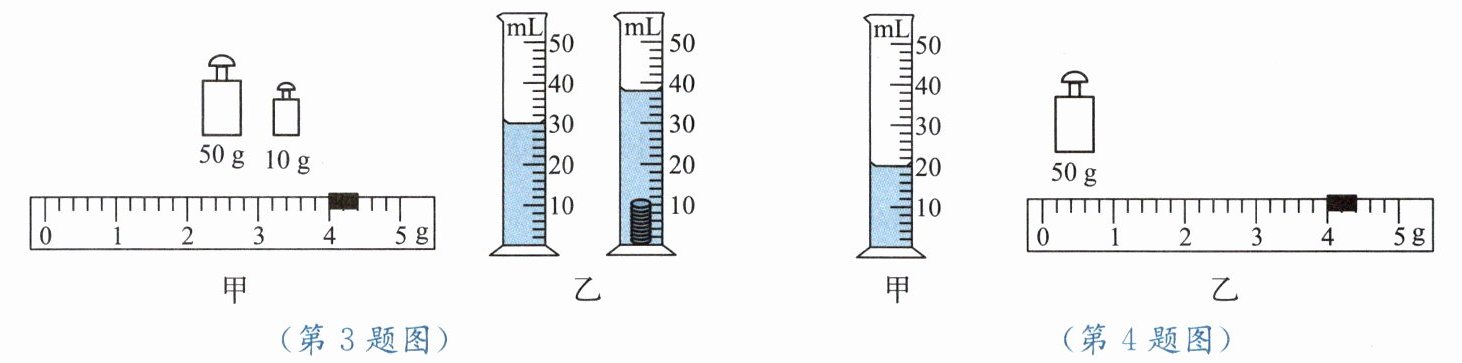 (4) 由图乙可知,砝码质量为50g,游码对应刻度值为4g,因此烧杯与剩余盐水的总质量为$50\ \mathrm{g}+4\ \mathrm{g}=54\ \mathrm{g}$;