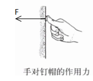 手对钉帽的压力:作用点选取钉帽处,方向垂直钉帽指向墙面,用带箭头的线段表示,标注为$F_{压}$(示意图参考参考答案中的对应图像)。