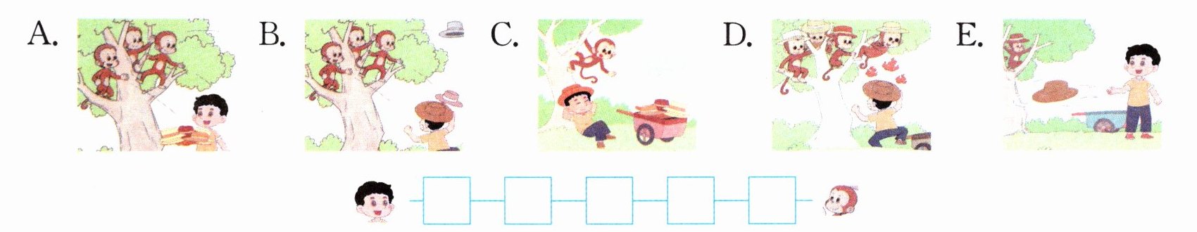 3. 农夫想出办法,扔掉自己的帽子引导猴子模仿,对应图片E;