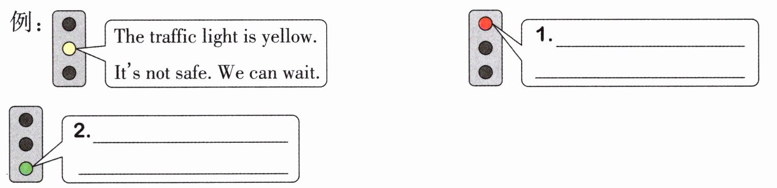 1. 观察第一个交通灯是红色,按照例句结构,先写描述颜色的句子:The traffic light is red. 红灯不安全,所以接着写It's not safe. 红灯时不能通行,最后写We can't go.