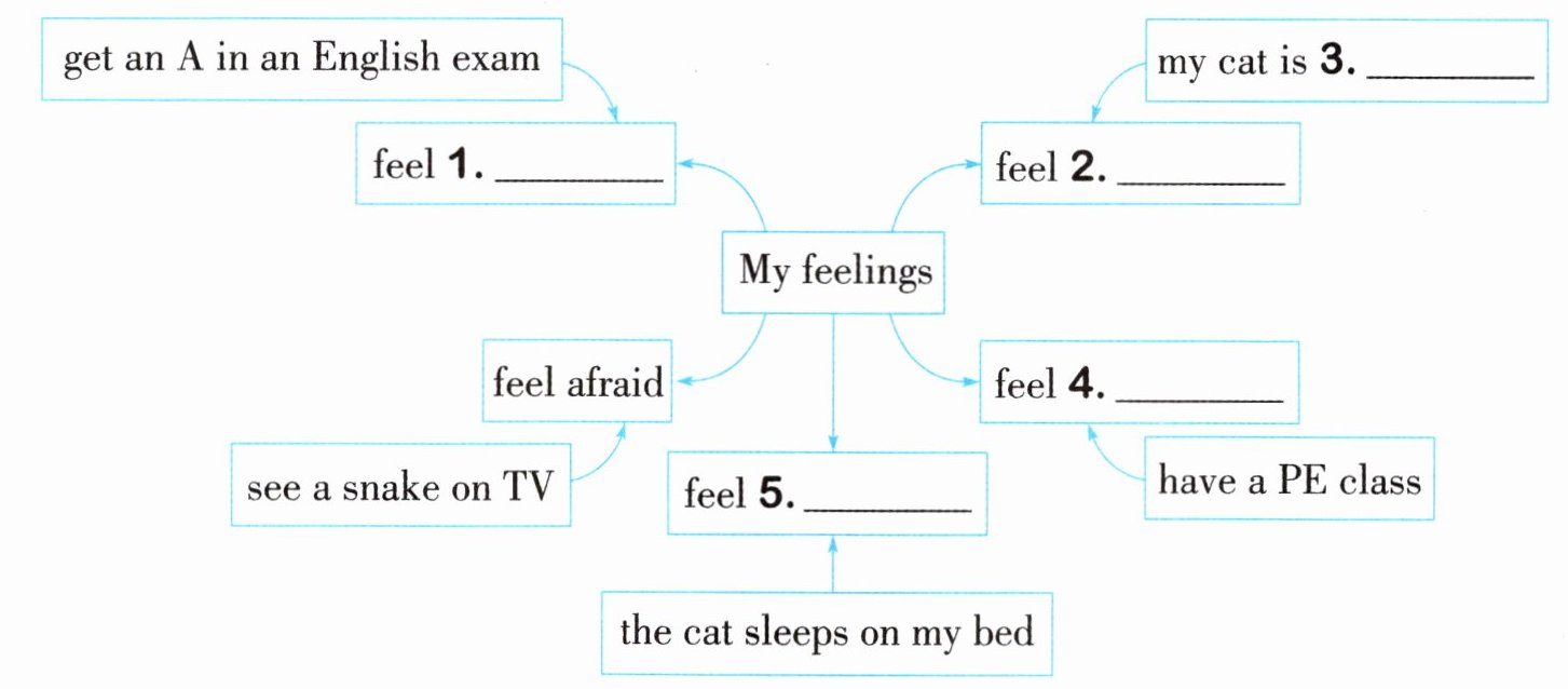 3. 再对应“have a PE class”“the cat sleeps on my bed”这些事件,分别找到短文里匹配的情绪词,完成填空。