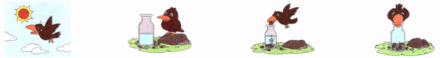 )4. The crow puts the stones into the bottle and he drinks the water.