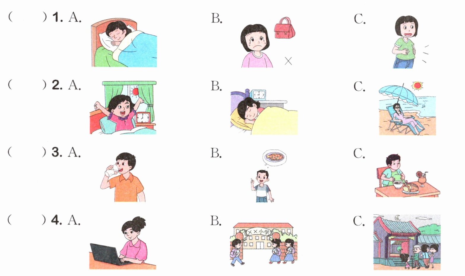 1. 先提前观察每道题的三张图片,明确每张图片所代表的场景或动作,比如第1题A是睡觉,B是丢失物品后难过,C是肚子饿;第2题A是起床,B是睡觉,C是海边休闲;第3题A是喝东西,B是想吃鱼,C是用餐;第4题A是用电脑工作,B是上学,C是拜访长辈。