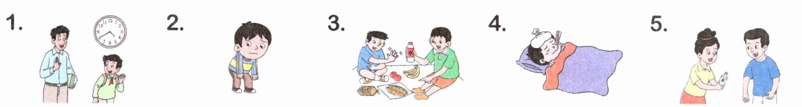 1. 先逐一观察每张图片,明确每个图片呈现的核心场景:图1是孩子与老师打招呼,时钟显示为上学时段;图2是男孩面露难过、身体不适;图3是两个男孩野餐并分享食物;图4是孩子发烧卧床休息;图5是女孩给男孩递物品。