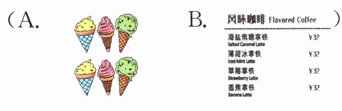 2. 句子“Here's our menu. What would you like?”意为“这是我们的菜单。你想要什么?”,对应图片B(图片B为菜单相关内容);