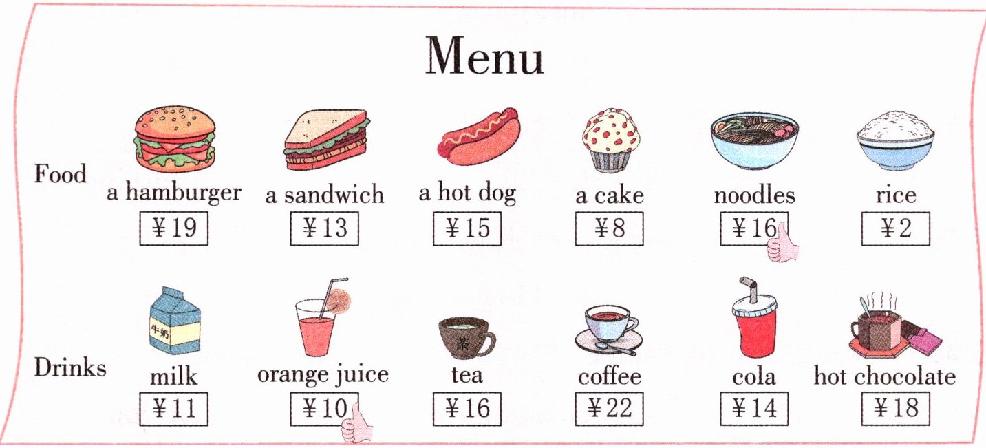 本题围绕生活中的菜单场景展开,考查学生的信息提取能力、数字认读能力和简单的价格比较能力,题目贴近生活,难度适中,需要学生仔细观察菜单细节来完成作答。