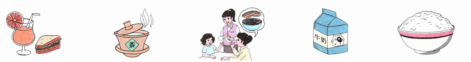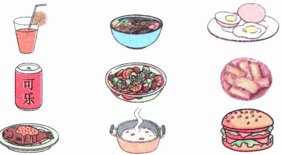 1. 先观察图片里的所有食物和饮料,熟悉它们对应的名称,做到心中有数;