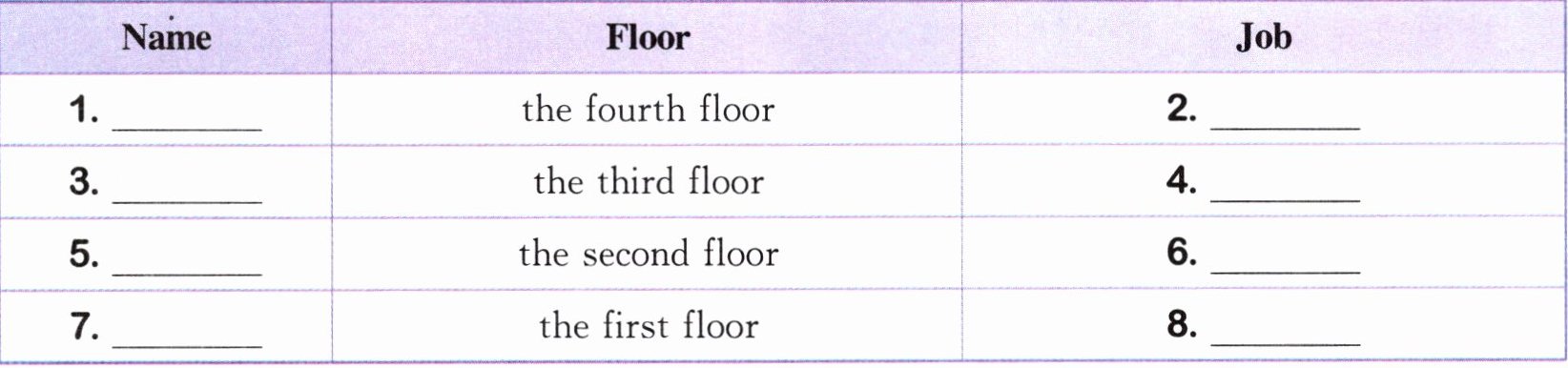 Tim, Sam, Amy and Lily are good friends. They live in a building(楼房) of four floors. They live on different floors. And they have different jobs: an engineer(工程师), a cook, a teacher and a nurse. Tim lives above(在……上方) Sam, but below(在……下方) Amy. Lily lives on the fourth(第四) floor. The nurse lives above the teacher, but below the cook. The engineer lives on the first floor. What are their jobs? Which floor does each of them live on?