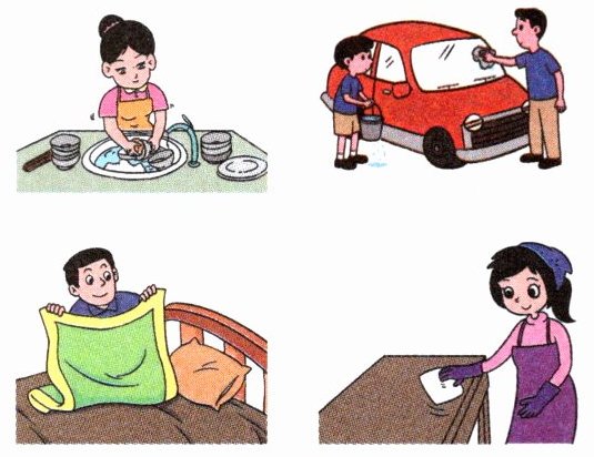 washing the dishes; cleaning the car; making the bed; clean the table