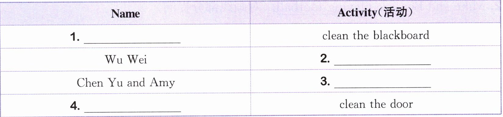 4. 原文“Zhang Peng is very tall, so he is cleaning the door. Peter is helping him”,可知做clean the door这个活动的是Zhang Peng和Peter,故填Zhang Peng and Peter。