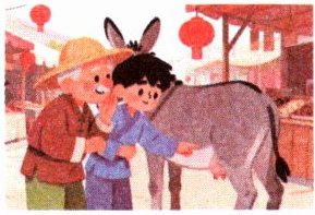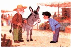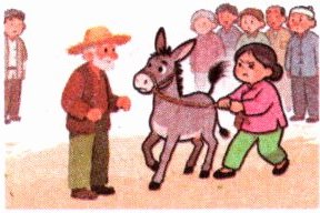 sell the donkey. A young man comes to the donkey and begins to look at it carefully(仔细地).