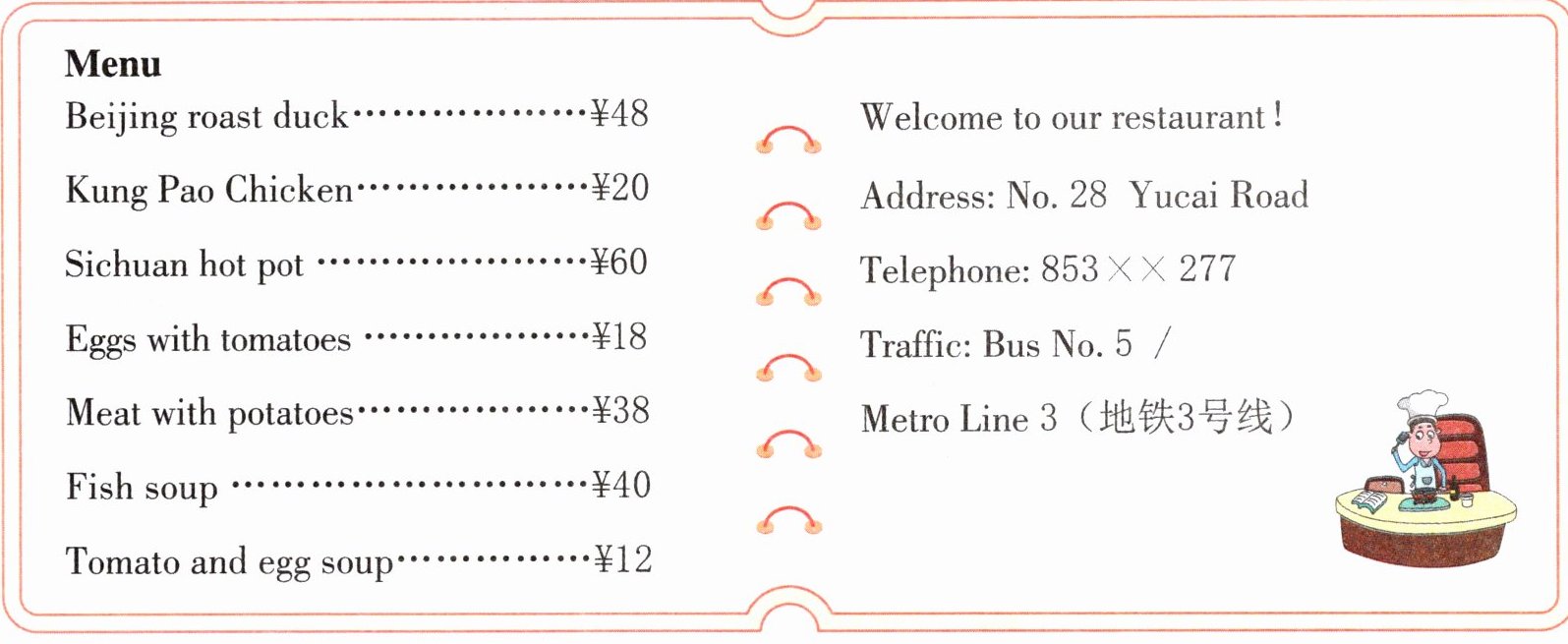 ) 3. You have fifty yuan. You can order meat with potatoes and tomato and egg soup.