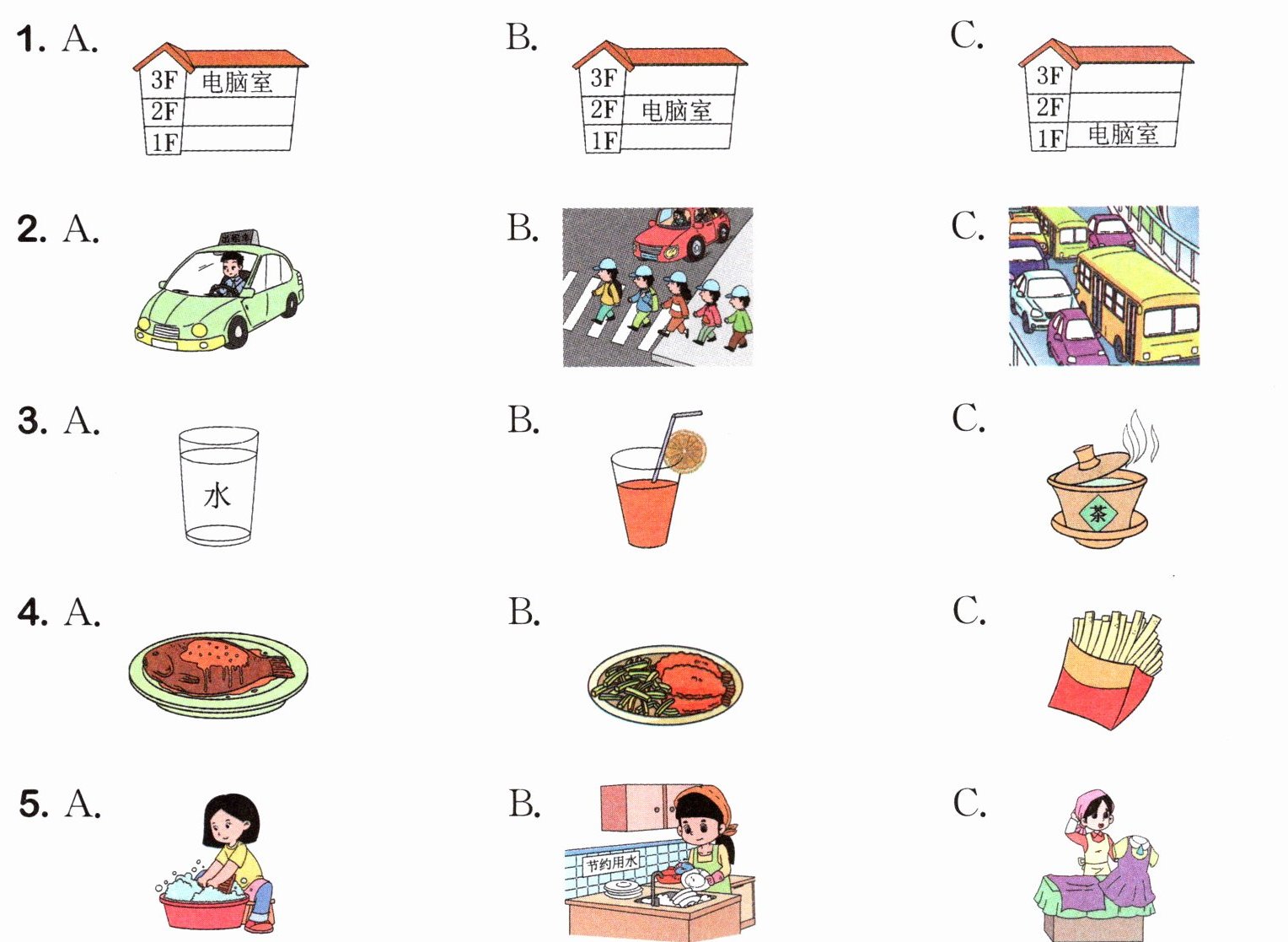 1. 听录音前,先逐一浏览每组图片,明确每个选项对应的内容,比如楼层位置、交通场景、饮品类型、食物种类、家务动作,提前在脑海中建立内容与词汇的关联。