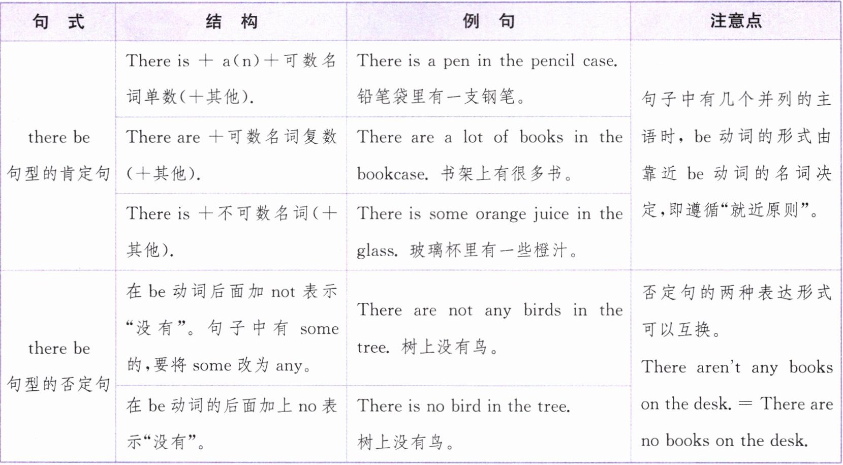 本题全面考查了there be句型的基础用法,涵盖肯定句、否定句形式,以及就近原则、some和any的转换等核心考点,能有效帮助学生巩固该句型的应用规则,是针对性很强的基础练习题。