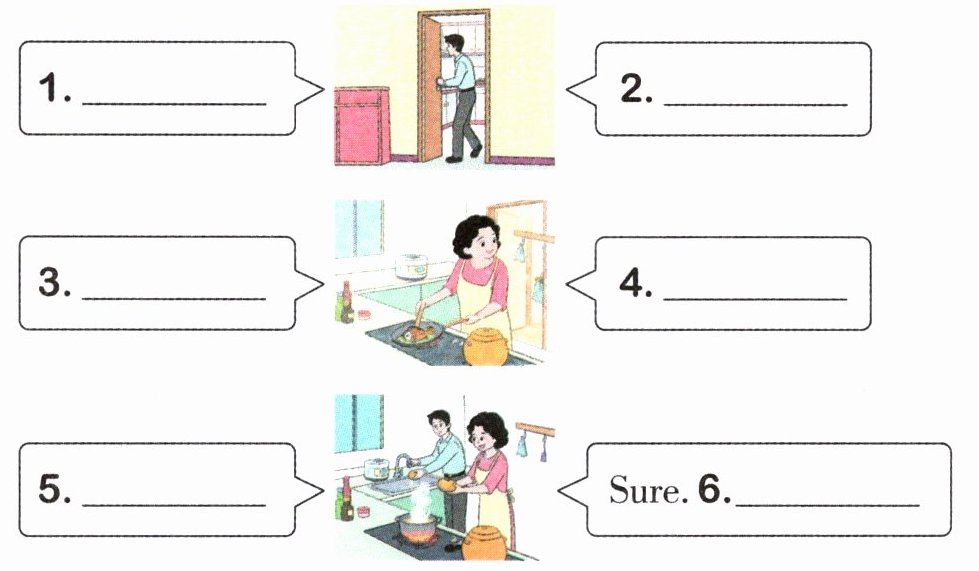 3. 第三幅图女士在做饭,男士应该询问对方是否在做晚饭;