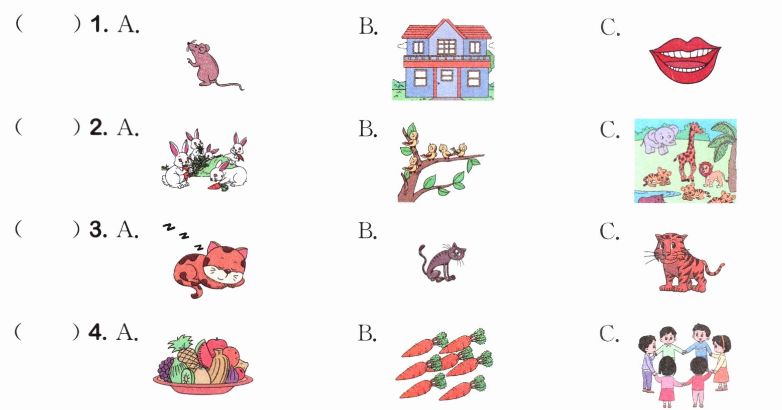 本题考查学生对常见动物、食物类词汇的听力识别能力,以及将听力内容与图片匹配的能力,需要学生提前熟悉图片对应的词汇,听录音时聚焦核心信息,侧重基础听力与认知的结合。