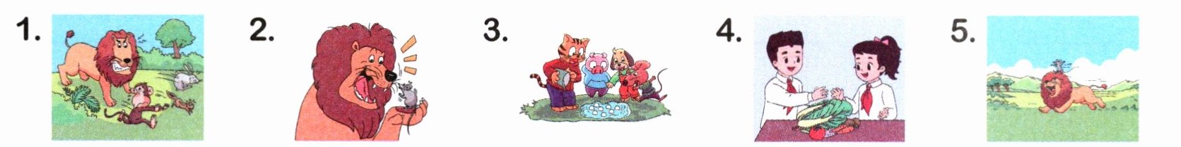 1. 听录音前,先逐一观察每幅图片,明确每幅图的核心元素与场景:图1是狮子发怒,周围小动物四散逃跑;图2是狮子托着小老鼠,二者互动;图3是几只小动物围着一堆蛋;图4是两个孩子在分蔬菜;图5是狮子头顶有东西,正在奔跑。